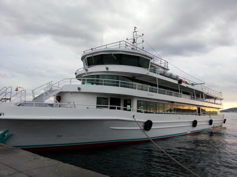 Bateau restaurant passagers de 50 m aménagé avec des salles fermées et des terrasses extérieurs aménagées pour des croisières gastronomiques festives avec 1200 pax