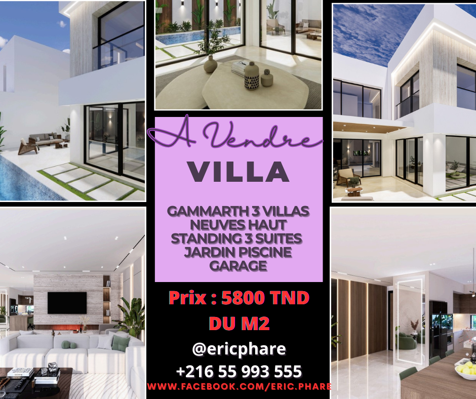 Gammarth villas haut standing en court de construction confort convivialité élégance et sécurité à vendre Gammarth nouvelle et grande villa moderne 3 suites jardin terrasse piscine parking sous sol… Voir plus